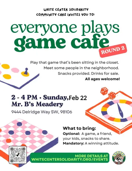 Bring your own game, or find one at Mr. B's to play. Meet some people in the neighborhood. Snacks provided. Drinks for sale. 2-4 pm on Sunday Feb. 22nd at Mr. B's Mead Center. Sponsored by White Center Solidarity. All ages welcome
